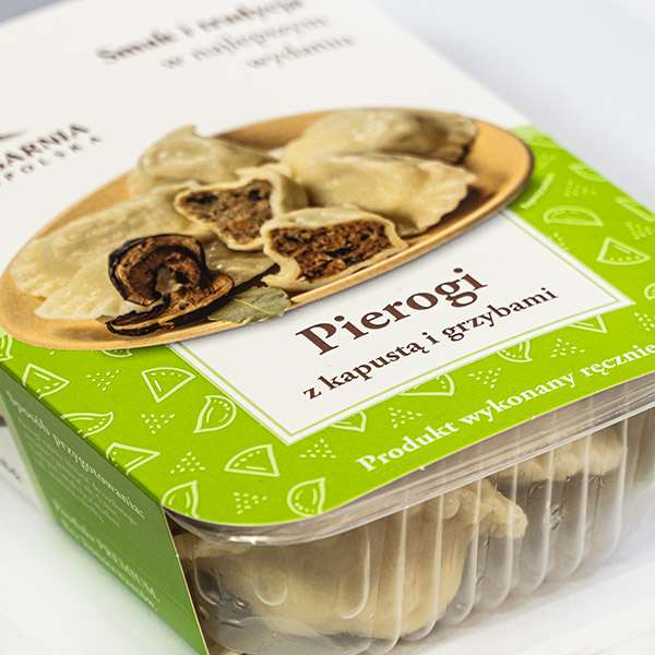Opakowanie zawiera 6 sztuk (ok. 330g) ręcznie robionych pierogów. Produkt pakowany w atmosferze ochronnej, gotowy do spożycia po obróbce termicznej.