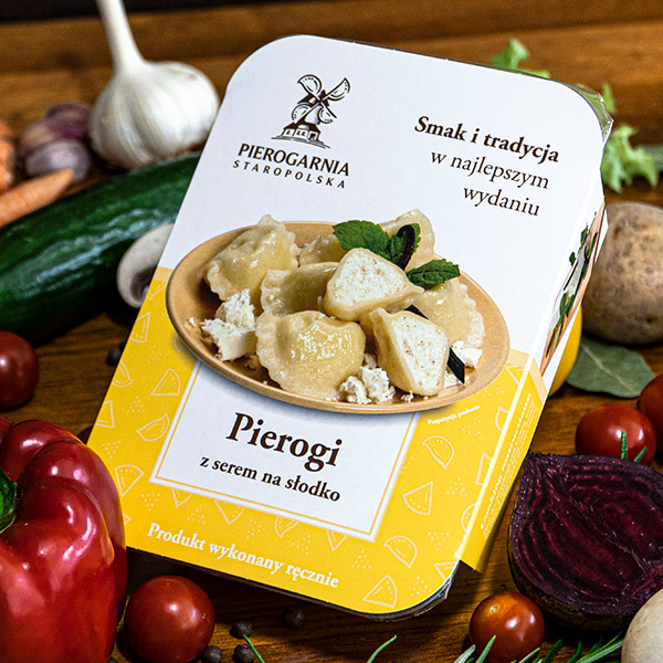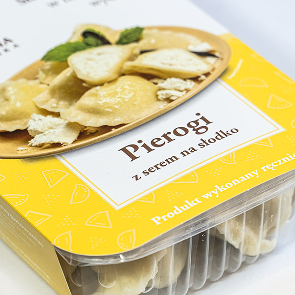 Opakowanie zawiera 6 sztuk (ok. 330g) ręcznie robionych pierogów. Produkt pakowany w atmosferze ochronnej, gotowy do spożycia po obróbce termicznej.